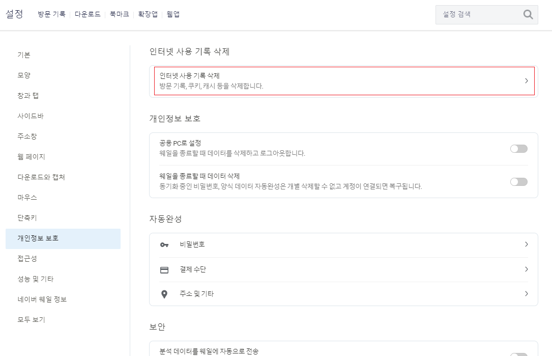 Naver Whale(웨일) 브라우저 캐시 삭제
