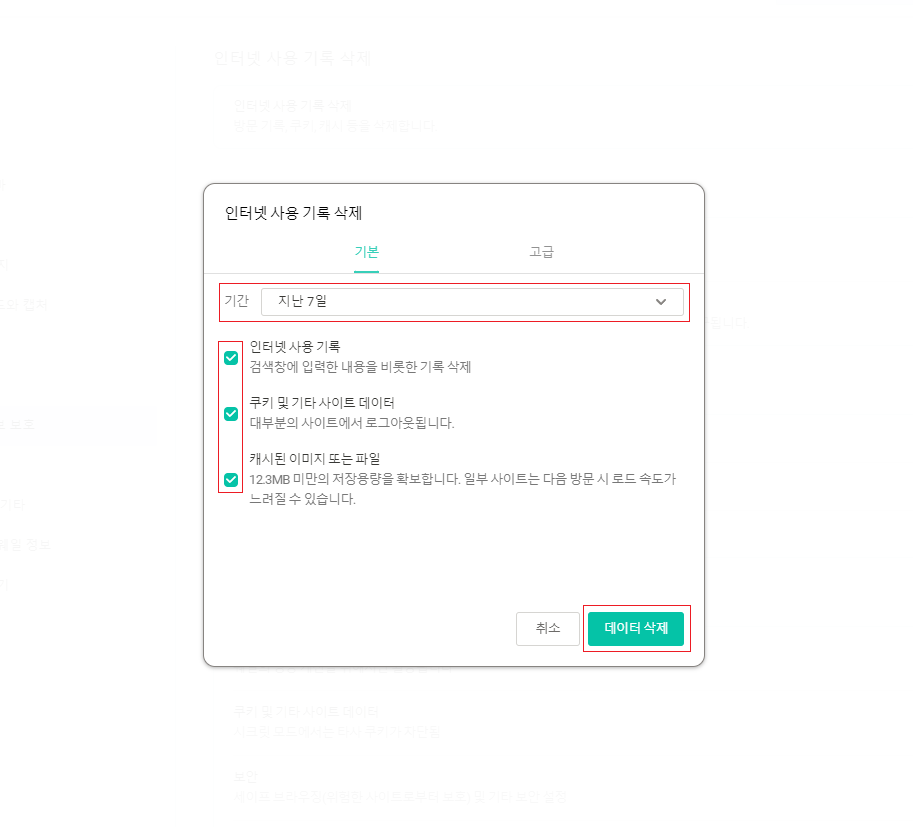 3. 기간선택후 > 아래 이미지와 같이 모두 체크 후 인터넷 사용 기록 삭제 클릭